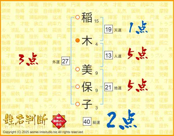 稲(15画)木(4画) 美(9画)保(9画)子(3画)