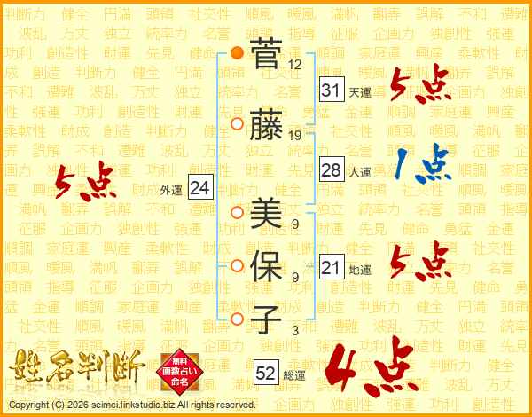 菅(12画)藤(19画) 美(9画)保(9画)子(3画)