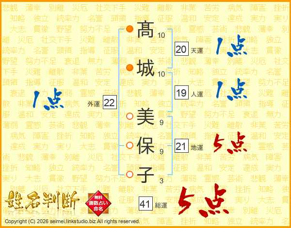 髙(10画)城(10画) 美(9画)保(9画)子(3画)