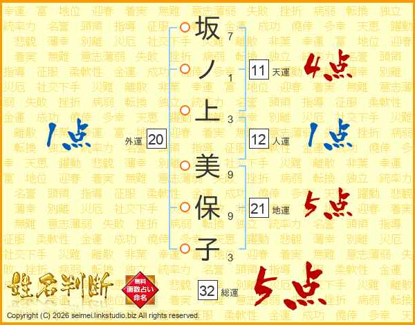 坂(7画)ノ(1画)上(3画) 美(9画)保(9画)子(3画)