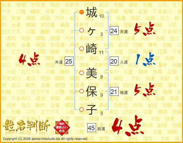 城(10画)ヶ(3画)崎(11画) 美(9画)保(9画)子(3画)
