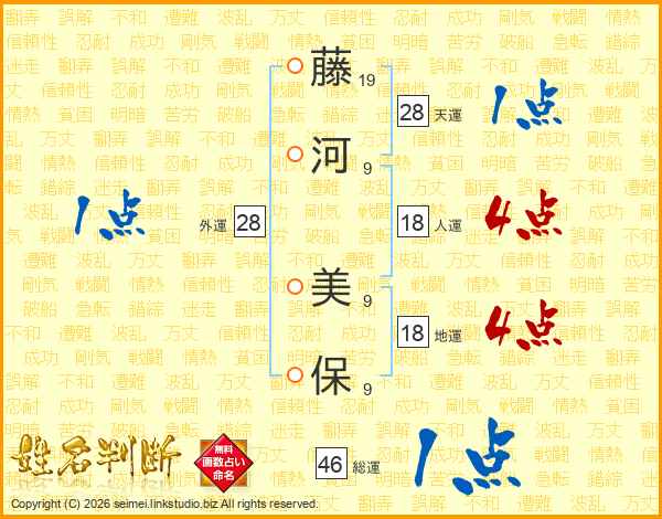 生活面を象徴する運勢です。外部から受ける影響力を表し、結婚運、家庭運や職場、環境への順応性を表します。総運から人運を引いた画数。姓や名が1文字の場合を除く。