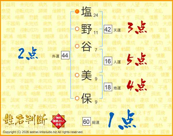 塩(24画)野(11画)谷(7画) 美(9画)保(9画)