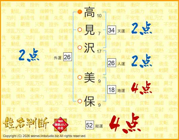 高(10画)見(7画)沢(17画) 美(9画)保(9画)