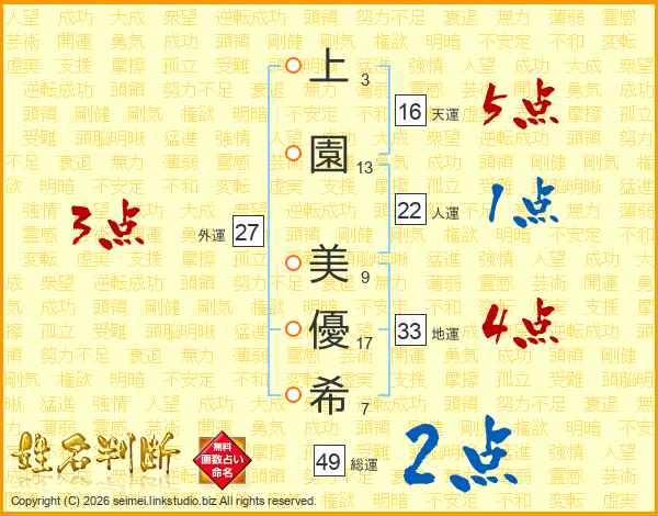 上(3画)園(13画) 美(9画)優(17画)希(7画)
