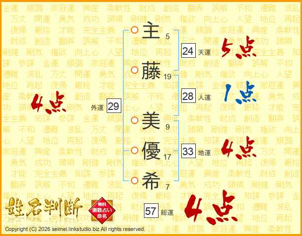 主(5画)藤(19画) 美(9画)優(17画)希(7画)