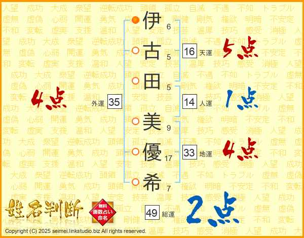 伊(6画)古(5画)田(5画) 美(9画)優(17画)希(7画)