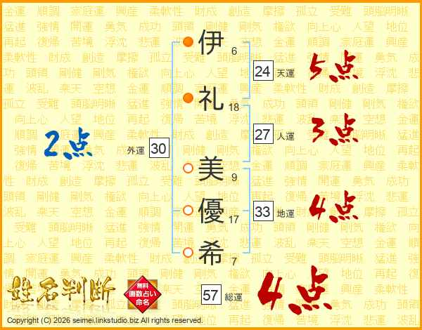 伊(6画)礼(18画) 美(9画)優(17画)希(7画)