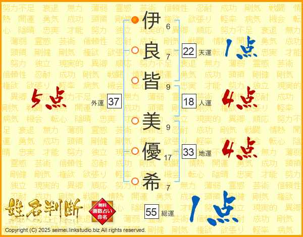 伊(6画)良(7画)皆(9画) 美(9画)優(17画)希(7画)