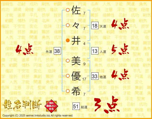 佐(7画)々(7画)井(4画) 美(9画)優(17画)希(7画)