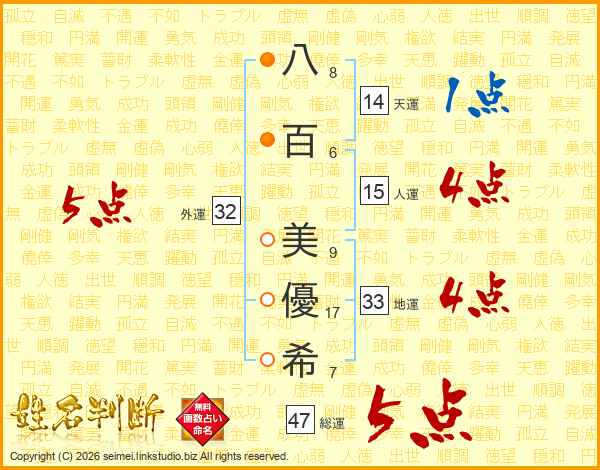 八(8画)百(6画) 美(9画)優(17画)希(7画)