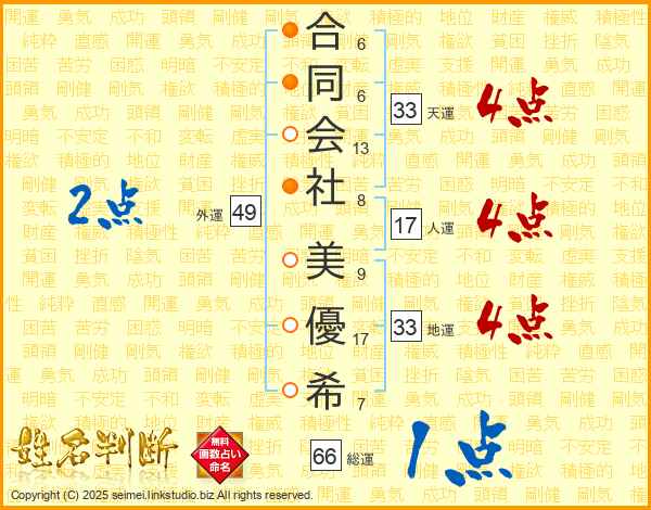 合(6画)同(6画)会(13画)社(8画) 美(9画)優(17画)希(7画)