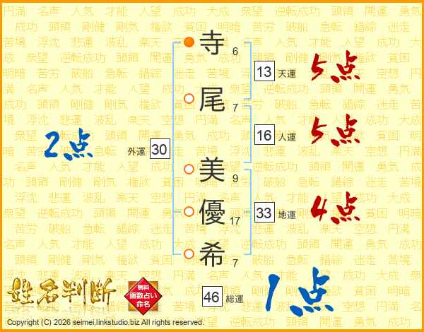 寺(6画)尾(7画) 美(9画)優(17画)希(7画)