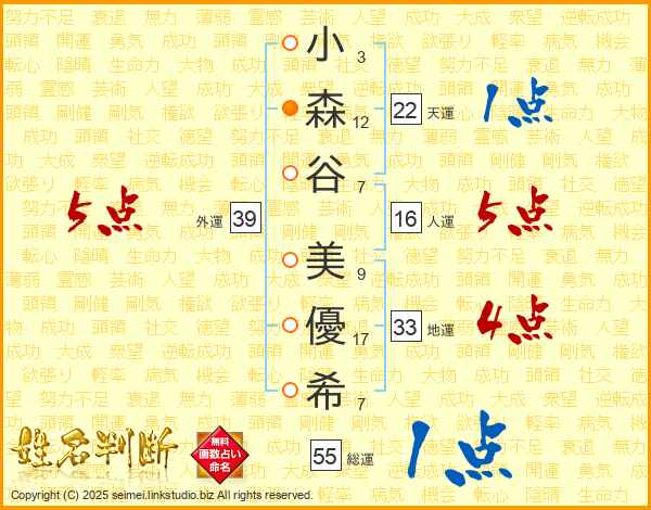 小(3画)森(12画)谷(7画) 美(9画)優(17画)希(7画)