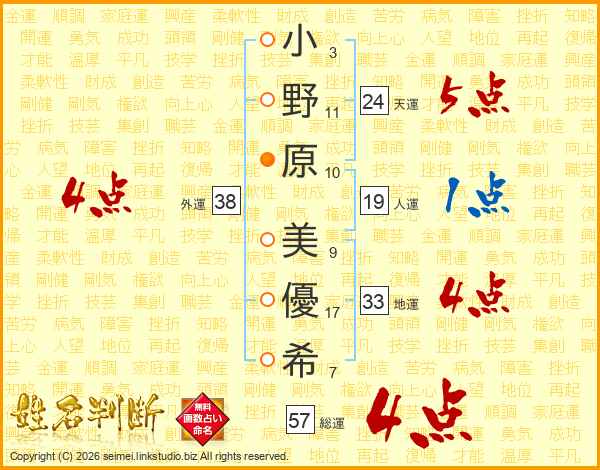 小(3画)野(11画)原(10画) 美(9画)優(17画)希(7画)