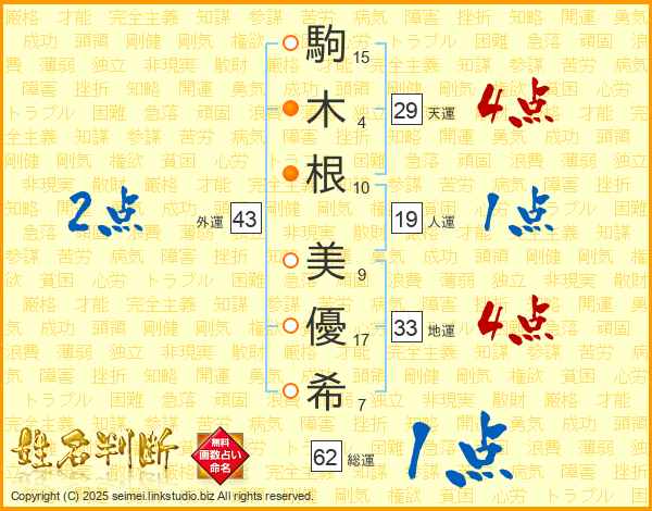駒(15画)木(4画)根(10画) 美(9画)優(17画)希(7画)