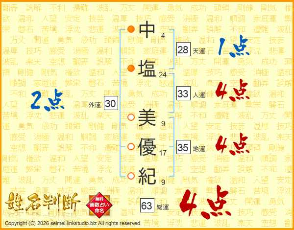 中(4画)塩(24画) 美(9画)優(17画)紀(9画)