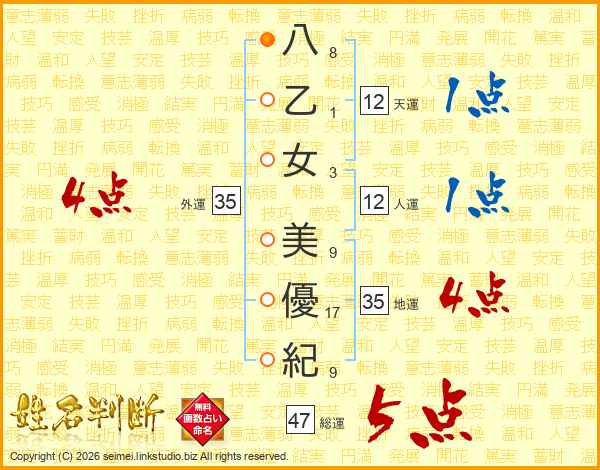 八(8画)乙(1画)女(3画) 美(9画)優(17画)紀(9画)