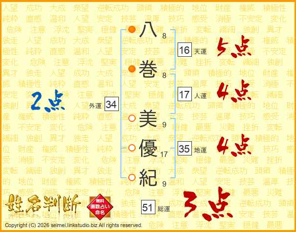 八(8画)巻(8画) 美(9画)優(17画)紀(9画)