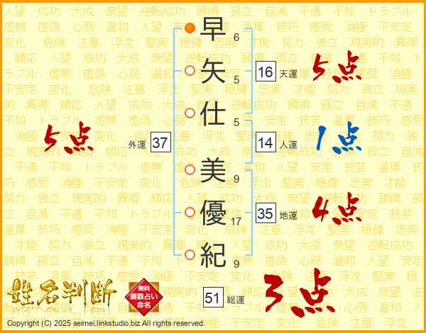 早(6画)矢(5画)仕(5画) 美(9画)優(17画)紀(9画)