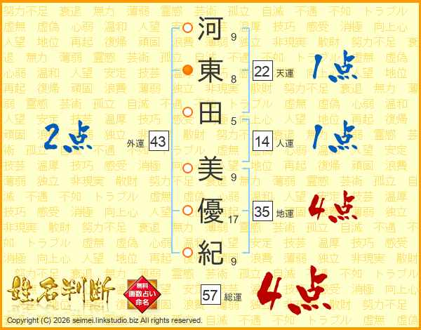 河(9画)東(8画)田(5画) 美(9画)優(17画)紀(9画)