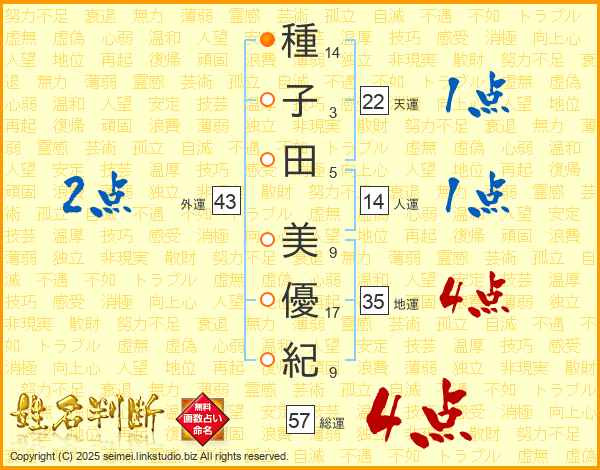 種(14画)子(3画)田(5画) 美(9画)優(17画)紀(9画)