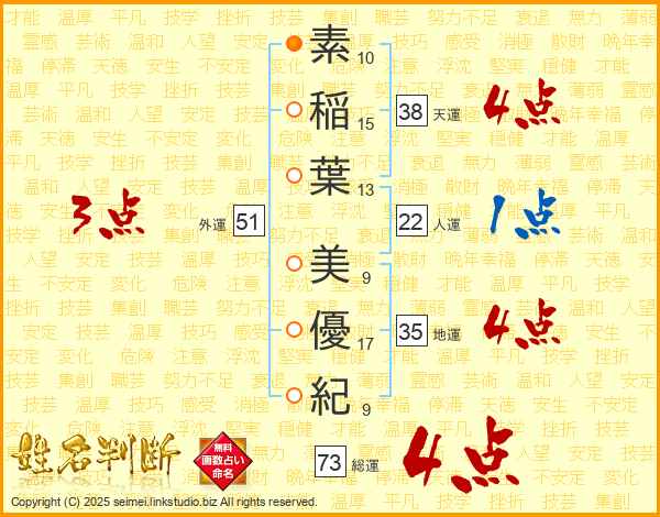 素(10画)稲(15画)葉(13画) 美(9画)優(17画)紀(9画)