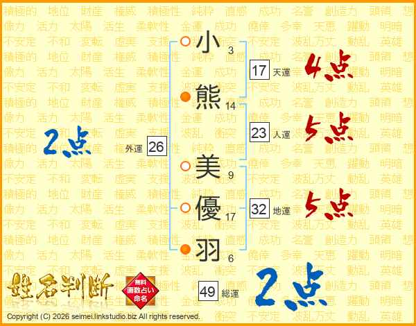 小(3画)熊(14画) 美(9画)優(17画)羽(6画)