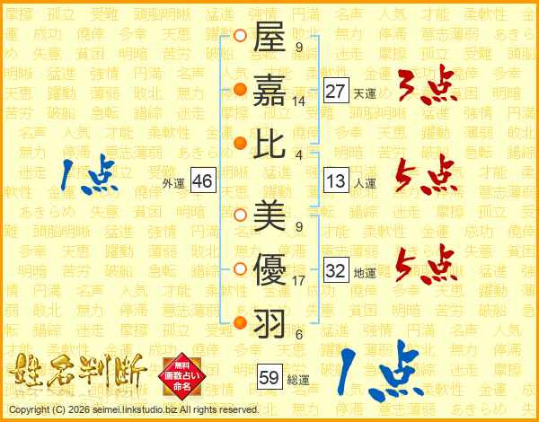 屋(9画)嘉(14画)比(4画) 美(9画)優(17画)羽(6画)