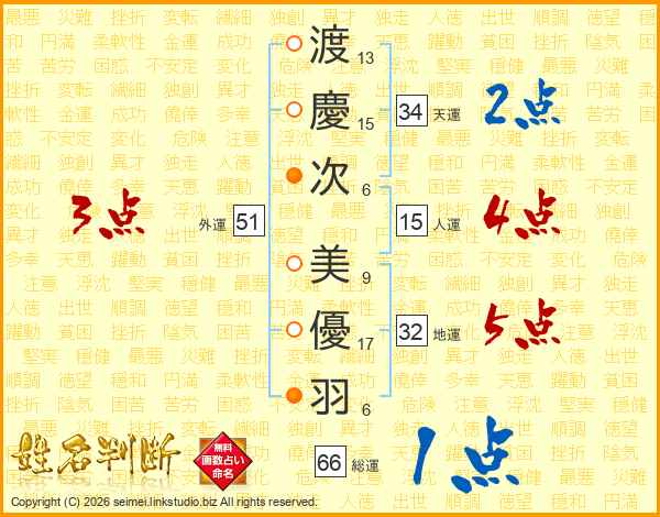 渡(13画)慶(15画)次(6画) 美(9画)優(17画)羽(6画)