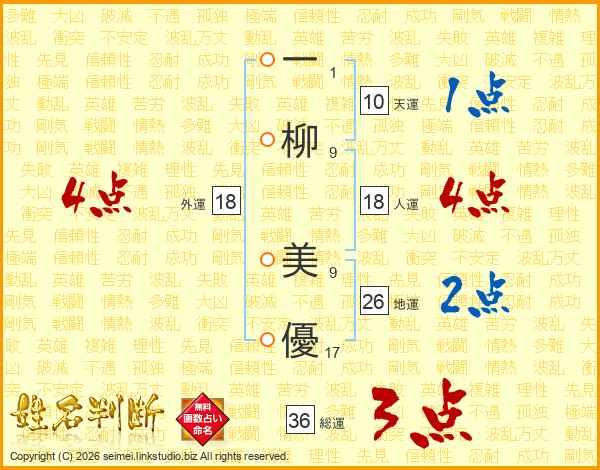 一(1画)柳(9画) 美(9画)優(17画)