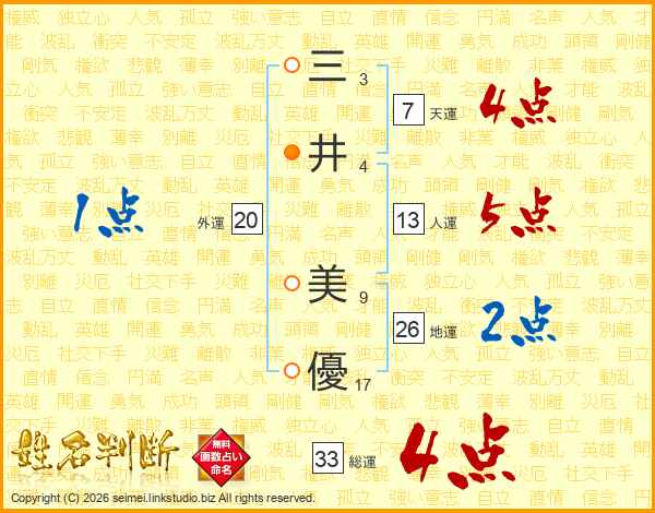 生活面を象徴する運勢です。外部から受ける影響力を表し、結婚運、家庭運や職場、環境への順応性を表します。総運から人運を引いた画数。姓や名が1文字の場合を除く。