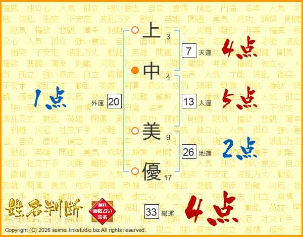 上(3画)中(4画) 美(9画)優(17画)