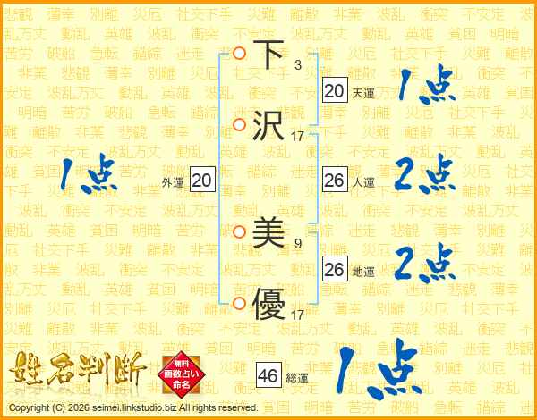 生活面を象徴する運勢です。外部から受ける影響力を表し、結婚運、家庭運や職場、環境への順応性を表します。総運から人運を引いた画数。姓や名が1文字の場合を除く。