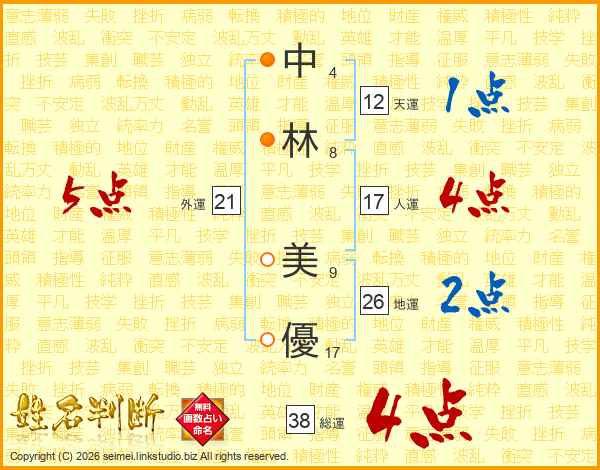 中(4画)林(8画) 美(9画)優(17画)
