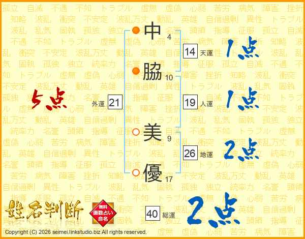 生活面を象徴する運勢です。外部から受ける影響力を表し、結婚運、家庭運や職場、環境への順応性を表します。総運から人運を引いた画数。姓や名が1文字の場合を除く。