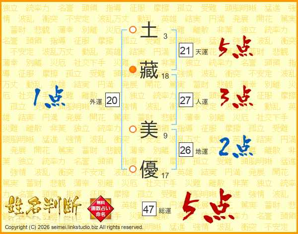 土(3画)藏(18画) 美(9画)優(17画)