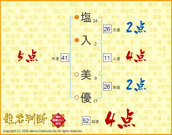 塩(24画)入(2画) 美(9画)優(17画)