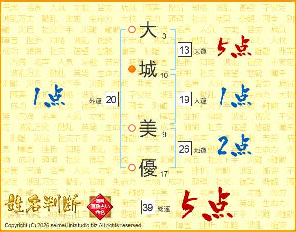 大(3画)城(10画) 美(9画)優(17画)