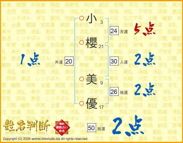 小(3画)櫻(21画) 美(9画)優(17画)