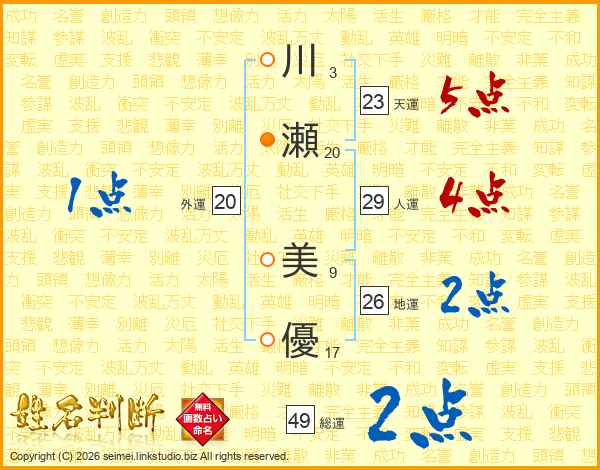 川(3画)瀬(20画) 美(9画)優(17画)