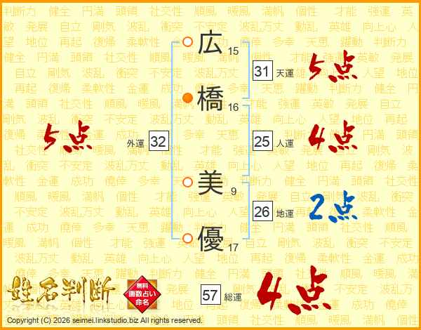 広(15画)橋(16画) 美(9画)優(17画)