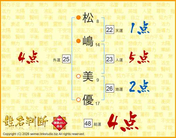 松(8画)嶋(14画) 美(9画)優(17画)