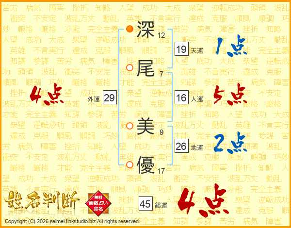 深(12画)尾(7画) 美(9画)優(17画)