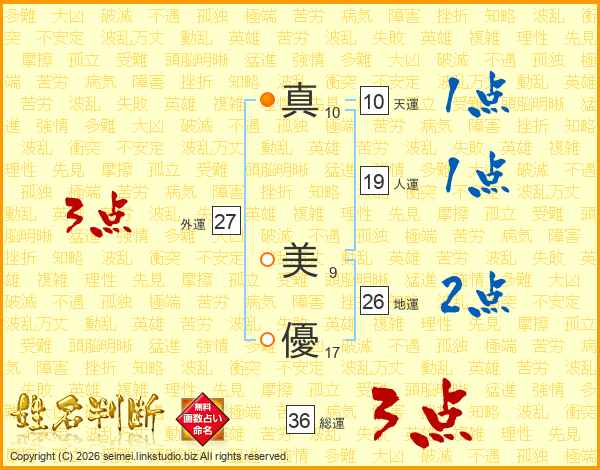 生活面を象徴する運勢です。外部から受ける影響力を表し、結婚運、家庭運や職場、環境への順応性を表します。総運から人運を引いた画数。姓や名が1文字の場合を除く。