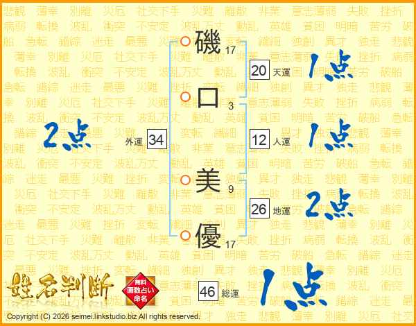磯(17画)口(3画) 美(9画)優(17画)