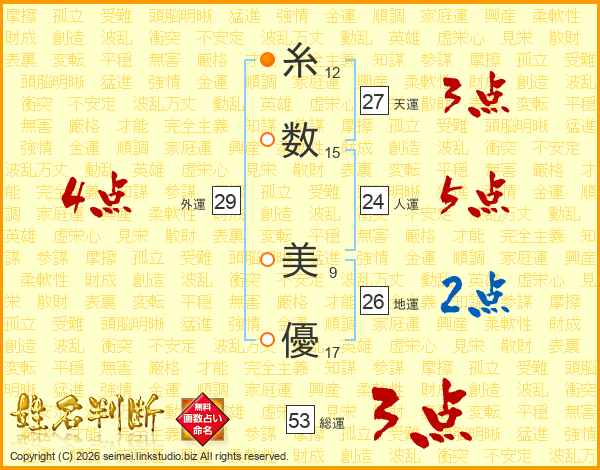 糸(12画)数(15画) 美(9画)優(17画)