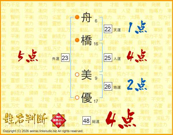 舟(6画)橋(16画) 美(9画)優(17画)