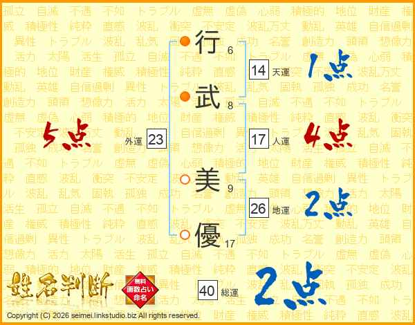 行(6画)武(8画) 美(9画)優(17画)