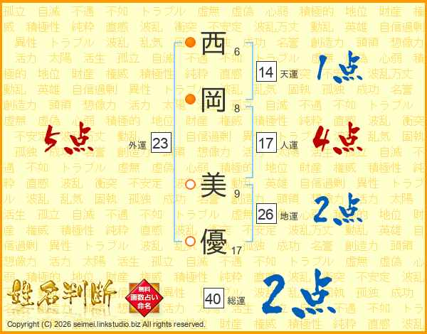 西(6画)岡(8画) 美(9画)優(17画)